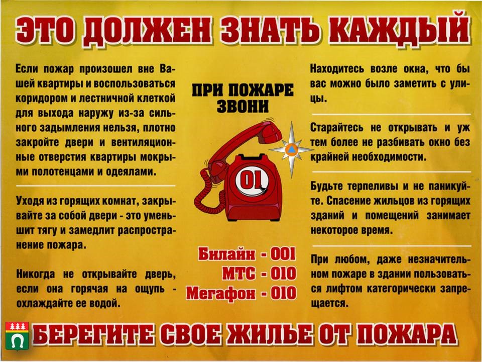 Если пожар возник и распространился в одной из комнат, не забудьте плотно закрыть двери горящей комнаты — это помешает огню распространиться по всей квартире и лестничной площадке. Уплотните дверь мокрыми тряпками, чтобы в остальные помещения дым не проникал. В сильно задымленном пространстве нужно двигаться ползком или пригнувшись.