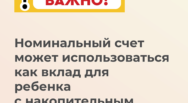 Номинальный счет может использоваться и как вклад для ребенка с накопительным процентом. При этом его можно открыть на длительный срок, и не нужно регулярно переоформлять. Таким способом Вы можете накопить, например, на будущее образование ребенка.