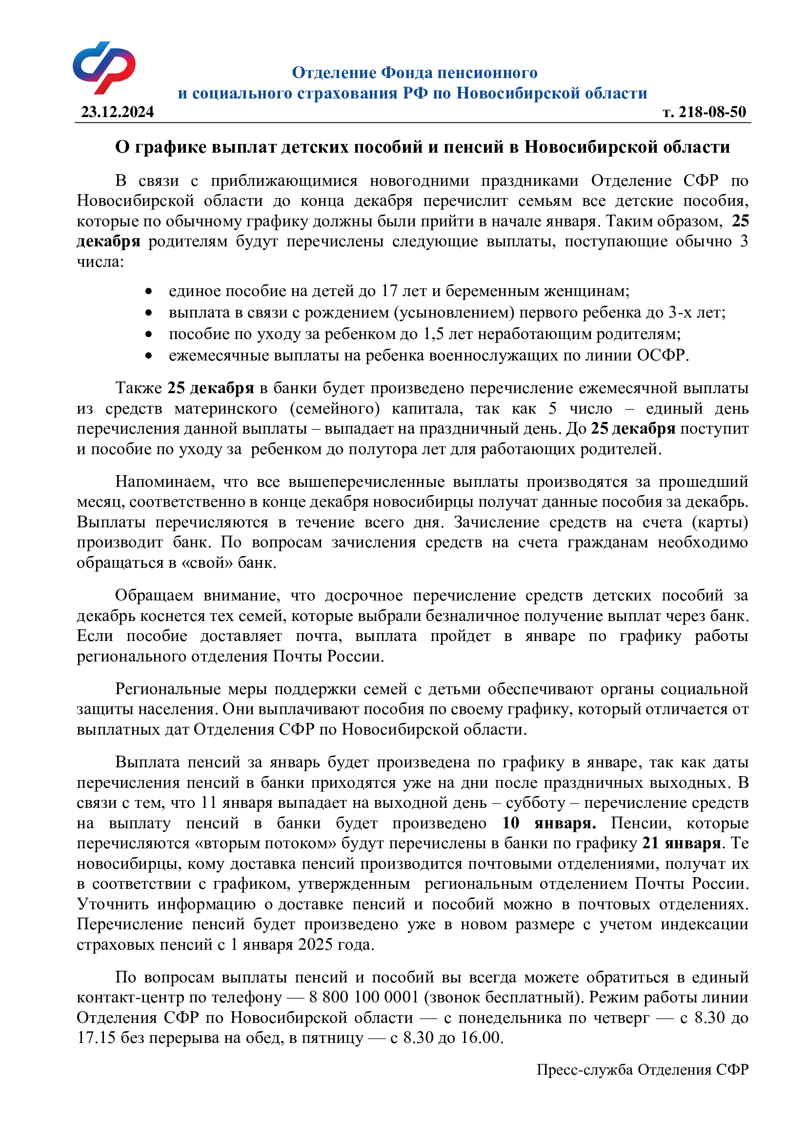График выплаты детских пособий и пенсий в связи с новогодними праздниками