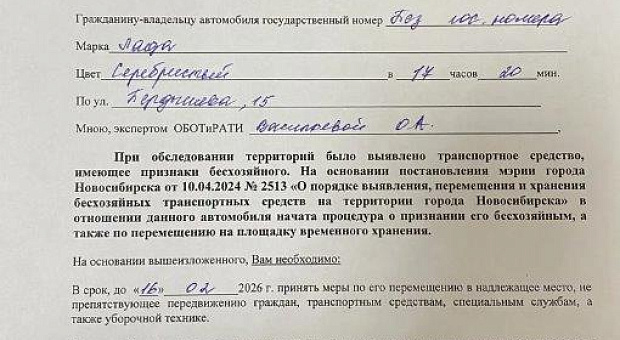 На основании Постановления мэрии города Новосибирска от 10.04.2024 № 2513 «О порядке выявления, перемещения и хранения бесхозяйных транспортных средств на территории Советского района города Новосибирска» в отношении данного автомобиля ведется процедура о признании его бесхозяйным, для дальнейшего перемещения на площадку временного хранения.