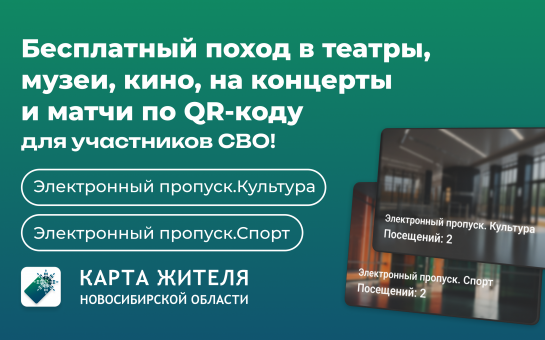 Новые сервисы для участников СВО региона «Электронный пропуск.Культура» и «Электронный пропуск.Спорт» внедрены в «Карте жителя Новосибирской области». При посещении учреждений участник СВО может не подтверждать статус бумажными документами, достаточно QR-кода в смартфоне.