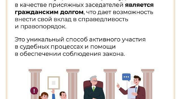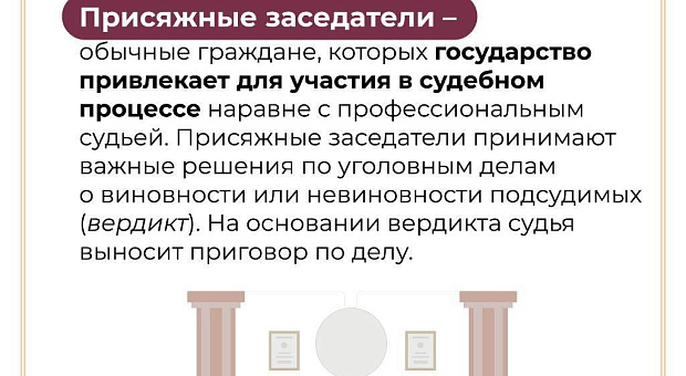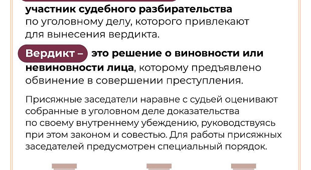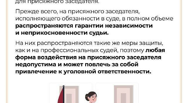 Присяжный заседатель участвует в судебном разбирательстве и в составе коллегии выносит вердикт. Деятельность в статусе присяжного заседателя является безопасной. На присяжного заседателя в период осуществления им правосудия распространяются гарантии независимости и неприкосновенности судей.