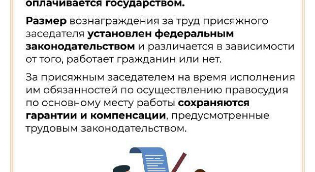 Участие присяжного заседателя в осуществлении правосудия оплачивается, ему возмещаются командировочные, транспортные расходы на проезд к месту нахождения суда и обратно. Законом гарантируется сохранение Вашего рабочего места на весь период исполнения обязанностей присяжного заседателя. Также по основному месту работы сохраняются гарантии и компенсации, предусмотренные трудовым законодательством. Увольнение или перевод на другую работу по инициативе работодателя в этот период не допускаются. Время исполнения присяжным заседателем обязанностей по осуществлению правосудия учитывается при исчислении всех видов трудового стажа.