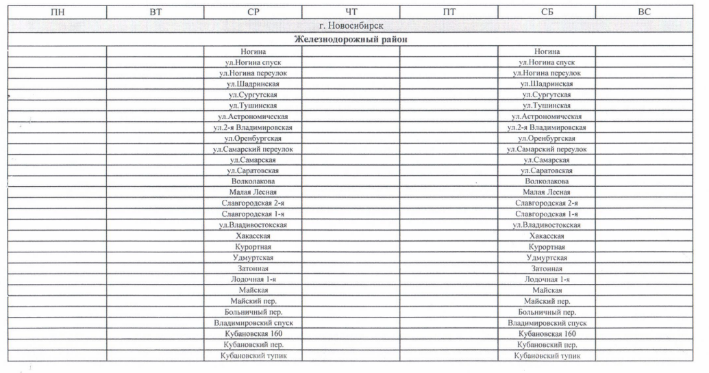 Информируем вас, что региональным оператором АО «Спецавтохозяйство» с территорий индивидуальной жилой застройки Заельцовского и Железнодорожного районов с 1 апреля 2026 года будет осуществляться кольцевой вывоз твердых коммунальных отходов 2 раза в неделю по прилагаемым графикам. Время вывоза твердых коммунальных отходов в течение дня с 07:00 до 22:00.